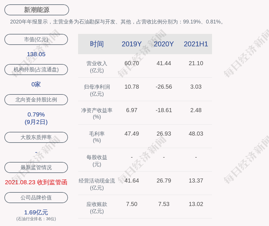 2020年年报显示,新潮能源的主营业务为石油勘探与开发、其他,占营收比例分别为:99.19%、0.81%。
