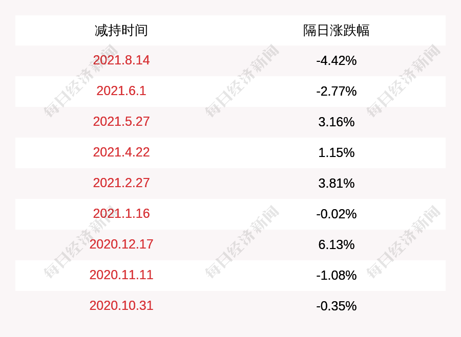 3. 宏发股份上次发布减持公告是2021年08月14日,第二个交易日下跌4.42%,宏发股份近一年共发布10次减持类公告。更多关键信息,请搜索“道达号”。