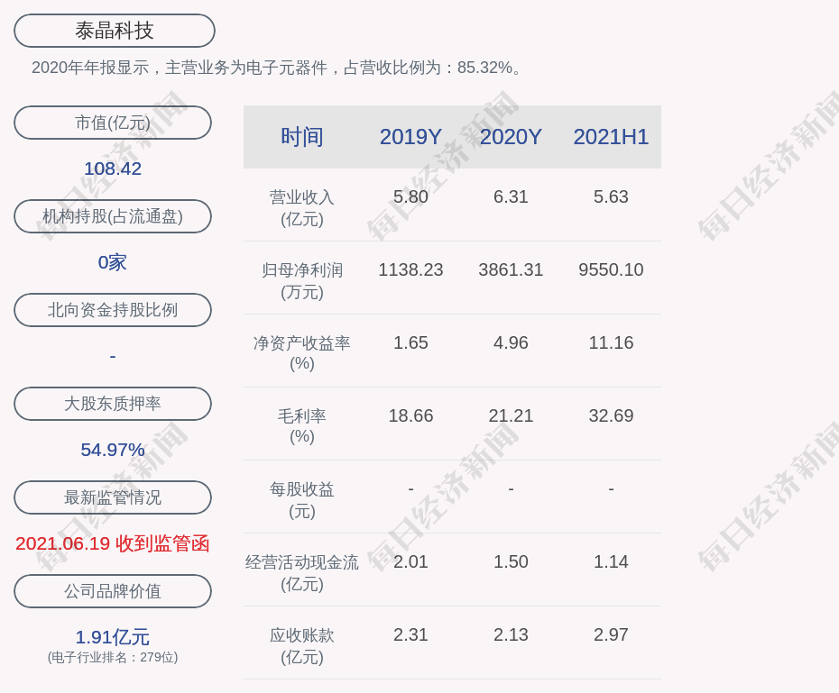 2020年年报显示,泰晶科技的主营业务为电子元器件,占营收比例为:85.32%。