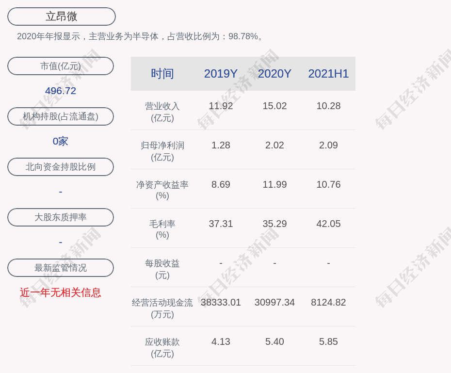 2020年年报显示,立昂微的主营业务为半导体,占营收比例为:98.78%。