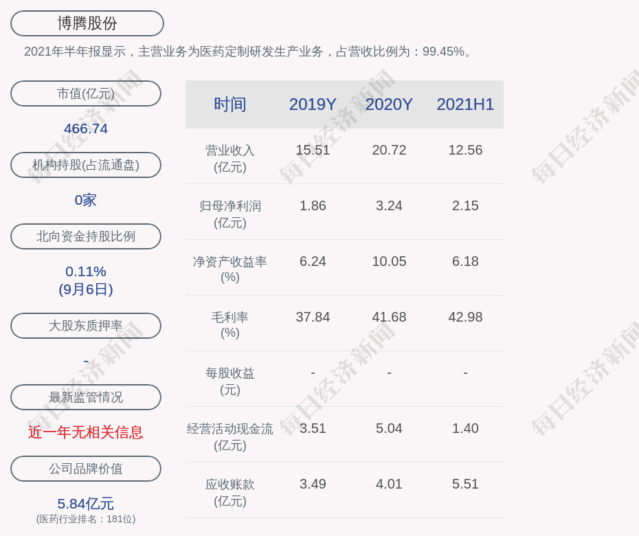 2021年半年报显示,博腾股份的主营业务为医药定制研发生产业务,占营收比例为:99.45%。