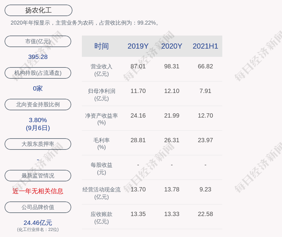 2020年年报显示,扬农化工的主营业务为农药,占营收比例为:99.22%。