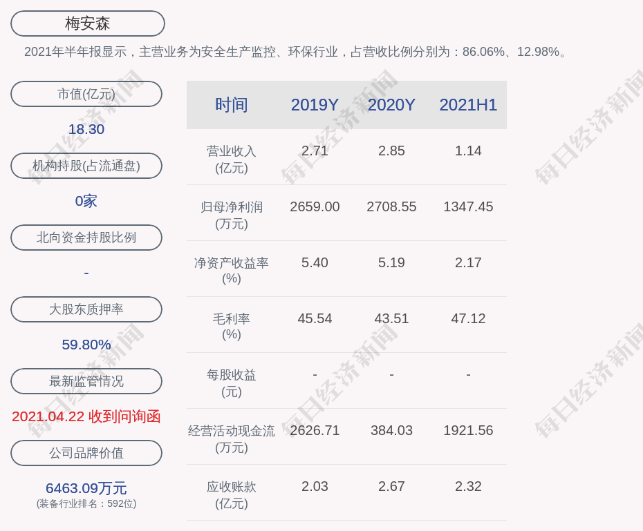 2021年半年报显示,梅安森的主营业务为安全生产监控、环保行业,占营收比例分别为:86.06%、12.98%。