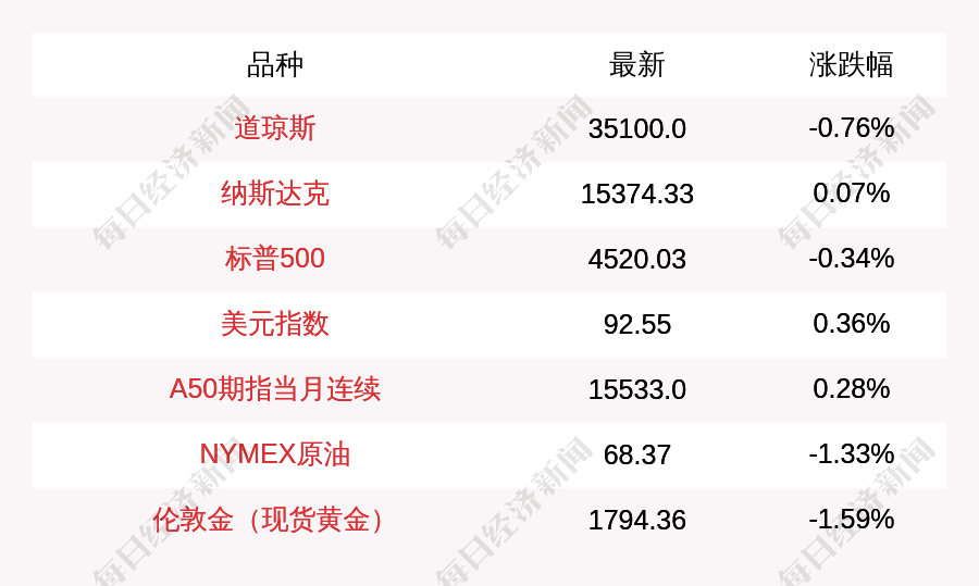 每经AI快讯:北京时间9月8日05:00,道琼斯收盘下跌269.09点,跌幅为0.76%,报35100.0点;纳斯达克收盘上涨10.81点,涨幅为0.07%,报15374.33点;标普500收盘下跌15.4点,跌幅为0.34%,报4520.03点;富时中国A50指数期货上涨43.0点,涨幅为0.28%,报15533.0点;NYMEX原油收盘下跌0.92点,跌幅为1.33%,报68.37点;美元指数收盘上涨0.33点,涨幅为0.36%,报92.55点;伦敦金(现货黄金)收盘下跌29.01点,跌幅为1.59%,报1794.36点。