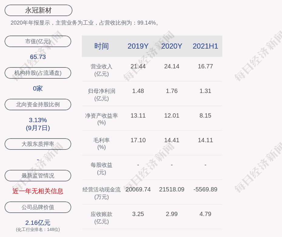 2020年年报显示,永冠新材的主营业务为工业,占营收比例为:99.14%。