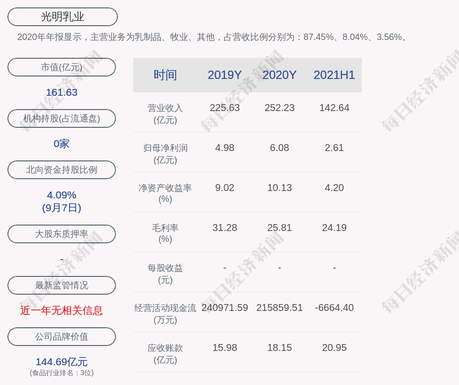 2020年年报显示,光明乳业的主营业务为乳制品、牧业、其他,占营收比例分别为:87.45%、8.04%、3.56%。