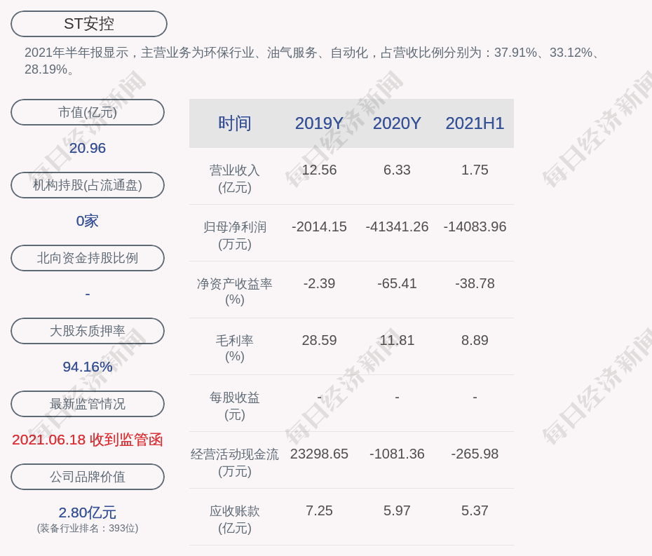 2021年半年报显示,ST安控的主营业务为环保行业、油气服务、自动化,占营收比例分别为:37.91%、33.12%、28.19%。