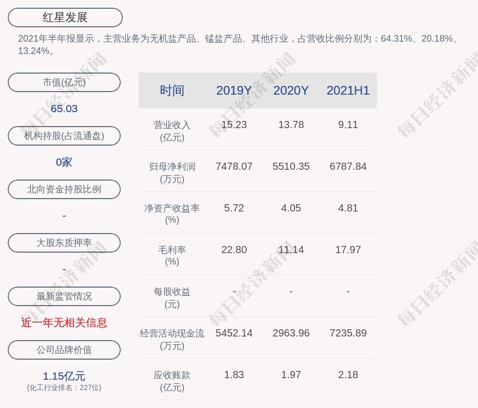 2021年半年报显示,红星发展的主营业务为无机盐产品、锰盐产品、其他行业,占营收比例分别为:64.31%、20.18%、13.24%。