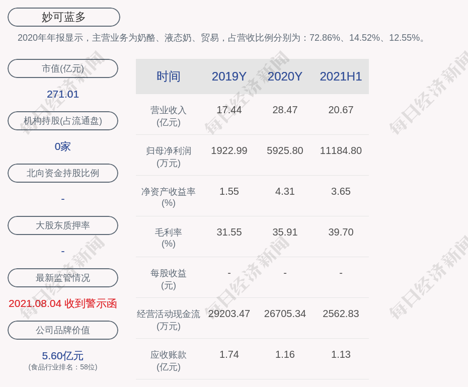 2020年年报显示,妙可蓝多的主营业务为奶酪、液态奶、贸易,占营收比例分别为:72.86%、14.52%、12.55%。