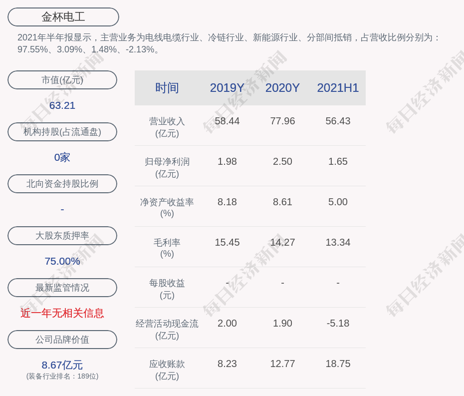 2021年半年报显示,金杯电工的主营业务为电线电缆行业、冷链行业、新能源行业、分部间抵销,占营收比例分别为:97.55%、3.09%、1.48%、-2.13%。