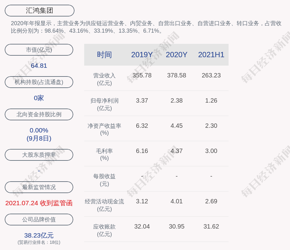 2020年年报显示,汇鸿集团的主营业务为供应链运营业务、内贸业务、自营出口业务、自营进口业务、转口业务。