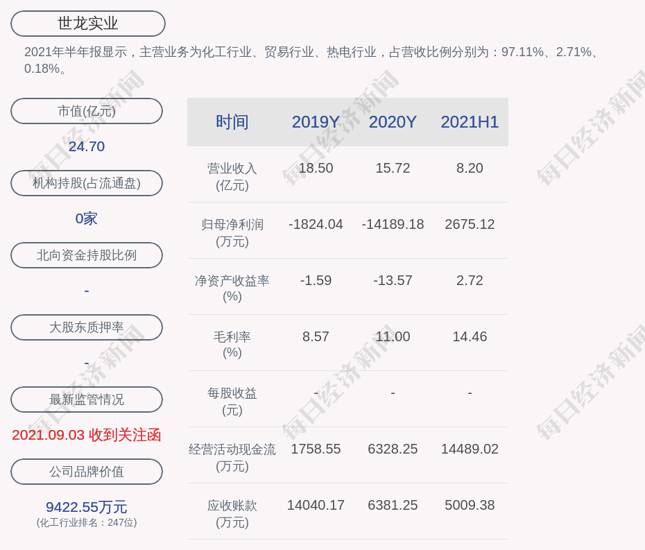 2021年半年报显示,世龙实业的主营业务为化工行业、贸易行业、热电行业,占营收比例分别为:97.11%、2.71%、0.18%。