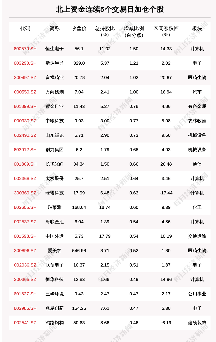 每经AI快讯,9月9日,北上资金连续5个交易日买入83个股。北上资金连续5个交易日加仓个股中,恒生电子(600570.SH,收盘价:56.1元)增持比例增幅最大,5个交易日增持1.50个百分点,其他增持比例较大的个股包括斯达半导(603290.SH,收盘价:329.0元)、富祥药业(300497.SZ,收盘价:20.78元)、万向钱潮(000559.SZ,收盘价:7.04元),分别增持1.21个百分点、1.02个百分点、1.00个百分点。