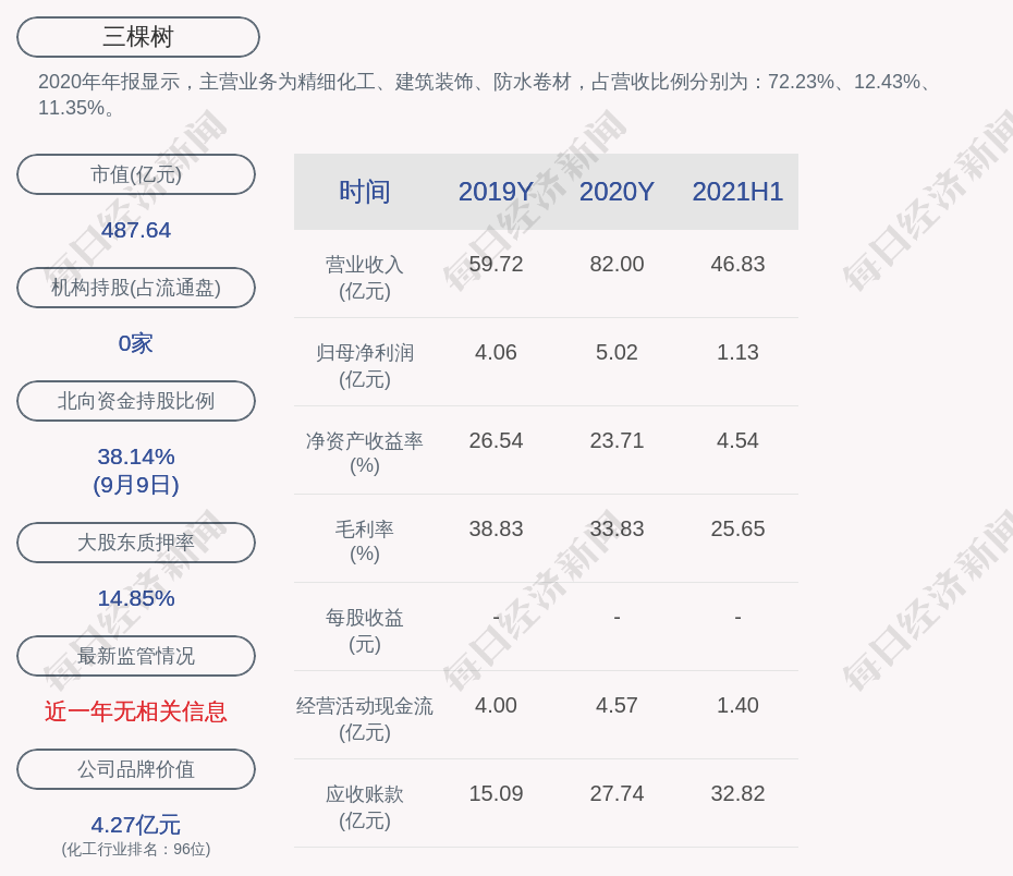 2020年年报显示,三棵树的主营业务为精细化工、建筑装饰、防水卷材,占营收比例分别为:72.23%、12.43%、11.35%。