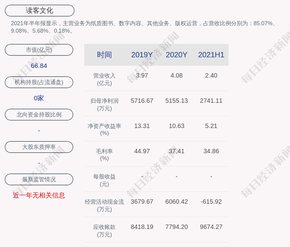 2021年半年报显示,读客文化的主营业务为纸质图书、数字内容、其他业务、版权运营,占营收比例分别为:85.07%、9.08%、5.68%、0.18%。