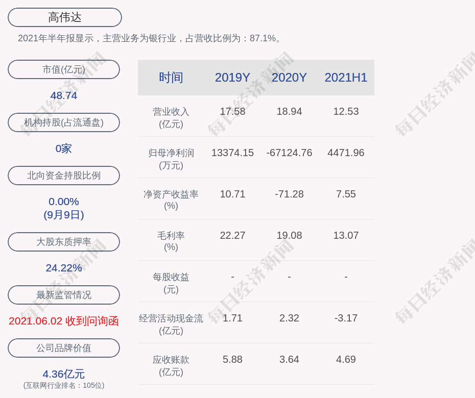 2021年半年报显示,高伟达的主营业务为银行业,占营收比例为:87.1%。