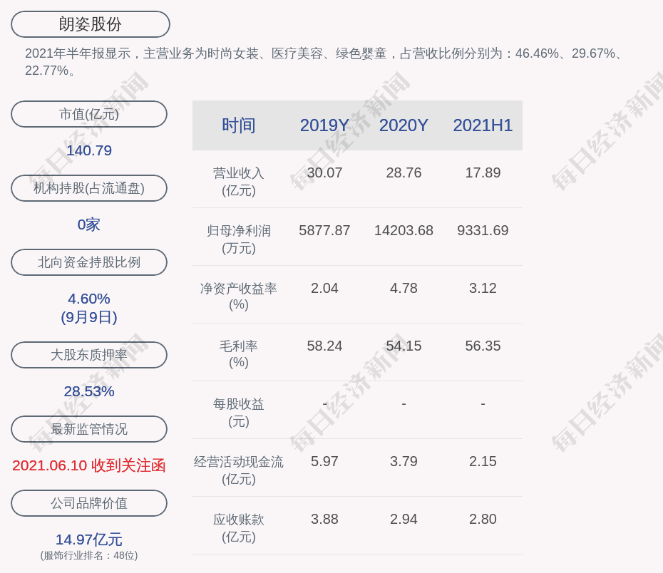 2021年半年报显示,朗姿股份的主营业务为时尚女装、医疗美容等。