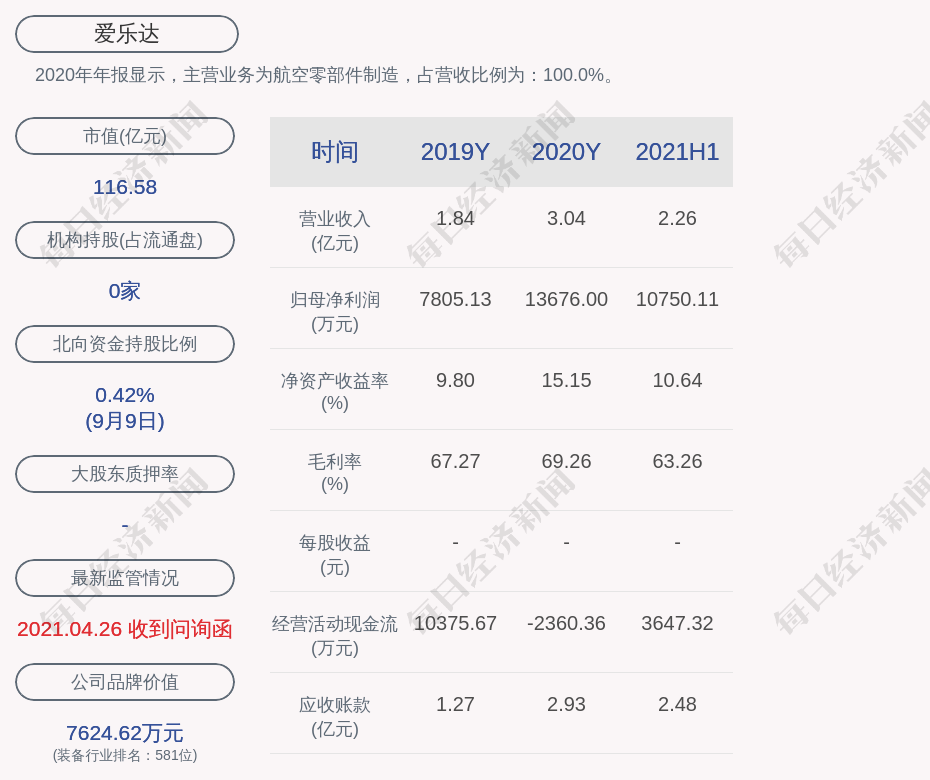 2020年年报显示,爱乐达的主营业务为航空零部件制造,占营收比例为:100.0%。