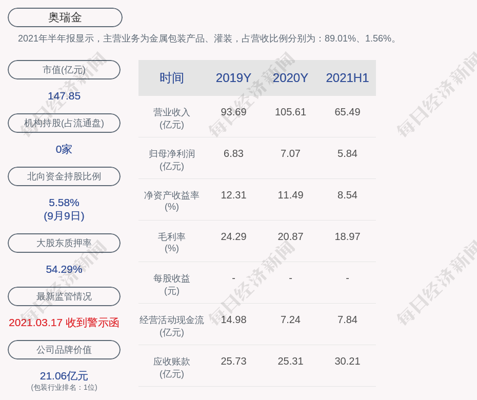 2021年半年报显示,奥瑞金的主营业务为金属包装产品、灌装,占营收比例分别为:89.01%、1.56%。