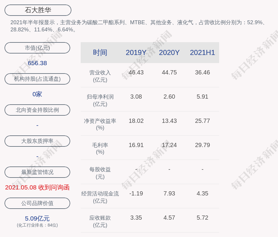 2021年半年报显示,石大胜华的主营业务为碳酸二甲酯系列、MTBE、其他业务、液化气,占营收比例分别为:52.9%、28.82%、11.64%、6.64%。