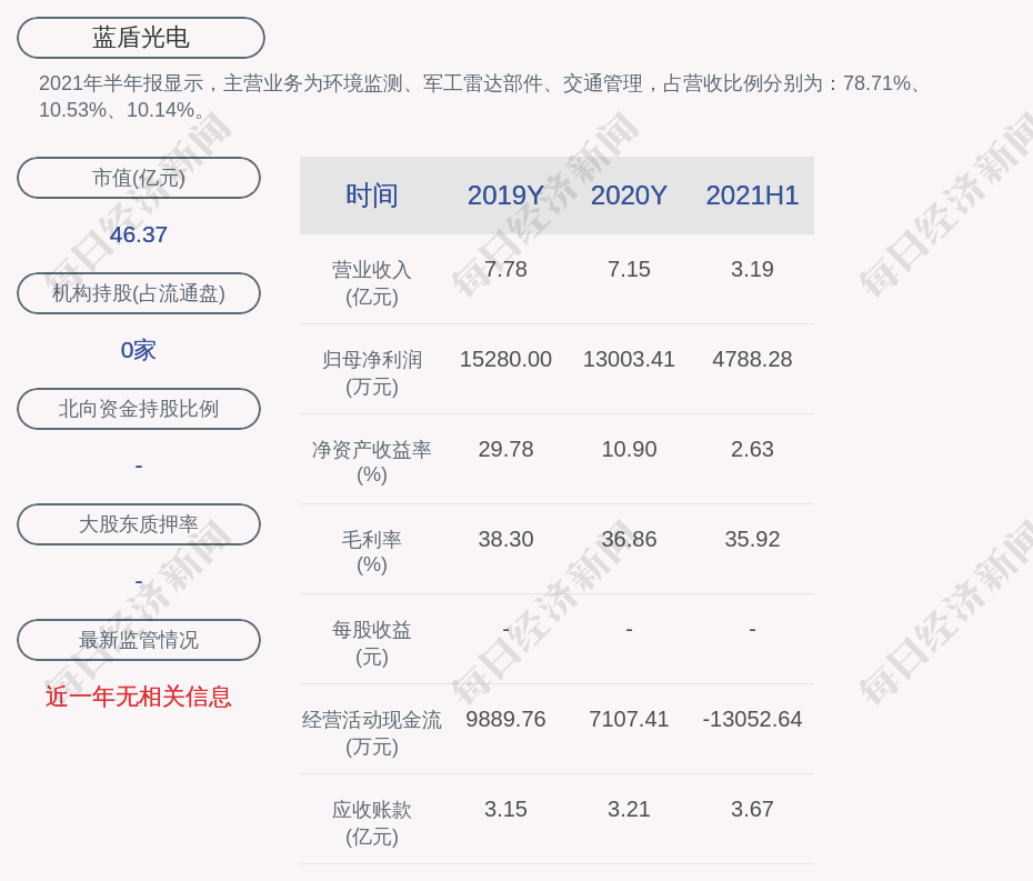 2021年半年报显示,蓝盾光电的主营业务为环境监测、军工雷达部件、交通管理,占营收比例分别为:78.71%、10.53%、10.14%。