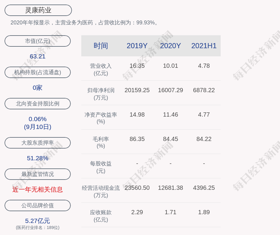 2020年年报显示,灵康药业的主营业务为医药,占营收比例为:99.93%。