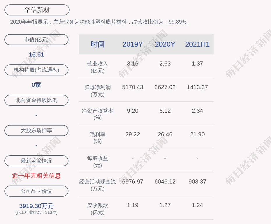2020年年报显示,华信新材的主营业务为功能性塑料膜片材料,占营收比例为:99.89%。
