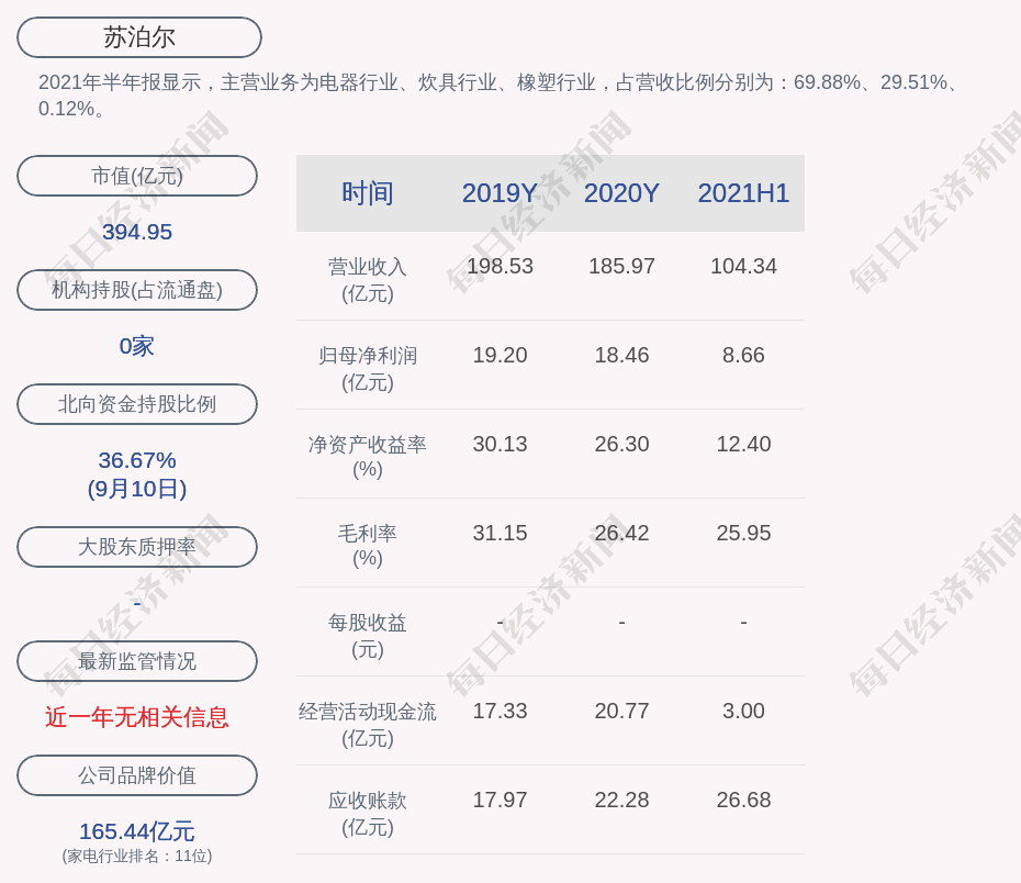 2021年半年报显示,苏泊尔的主营业务为电器行业、炊具行业、橡塑行业,占营收比例分别为:69.88%、29.51%、0.12%。