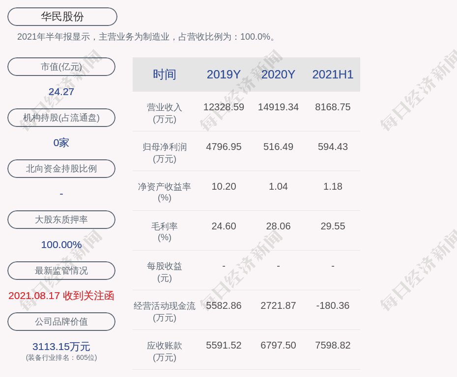 2021年半年报显示,华民股份的主营业务为制造业,占营收比例为:100.0%。