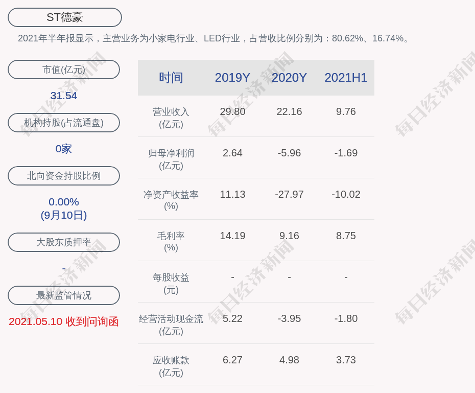 2021年半年报显示,ST德豪的主营业务为小家电行业、LED行业,占营收比例分别为:80.62%、16.74%。