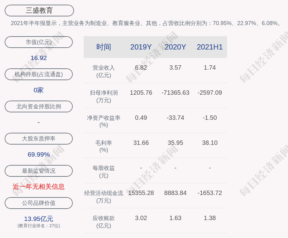 2021年半年报显示,三盛教育的主营业务为制造业、教育服务业、其他,占营收比例分别为:70.95%、22.97%、6.08%。
