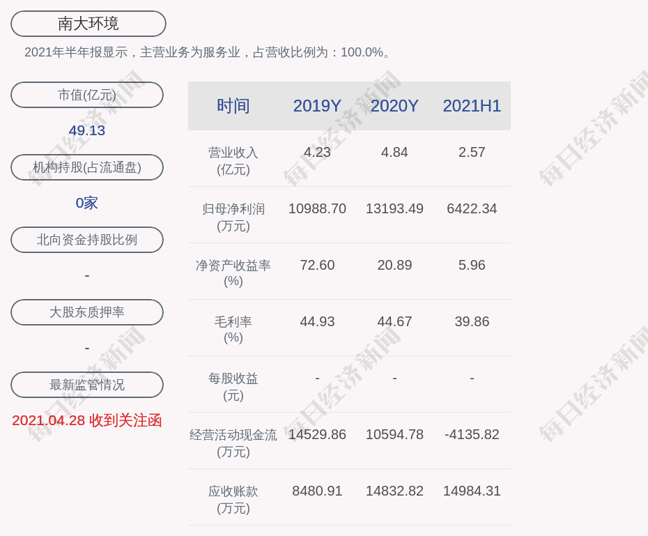 2021年半年报显示,南大环境的主营业务为服务业,占营收比例为:100.0%。