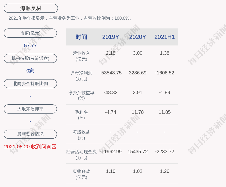 2021年半年报显示,海源复材的主营业务为工业,占营收比例为:100.0%。
