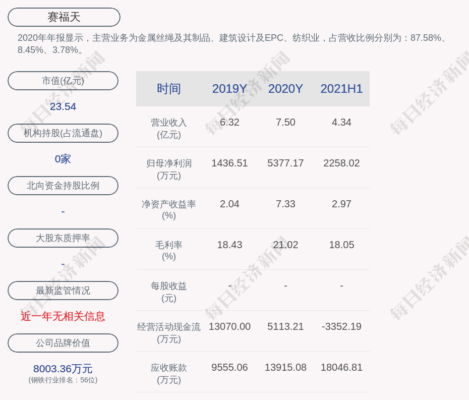 2020年年报显示,赛福天的主营业务为金属丝绳及其制品、建筑设计及EPC、纺织业,占营收比例分别为:87.58%、8.45%、3.78%。