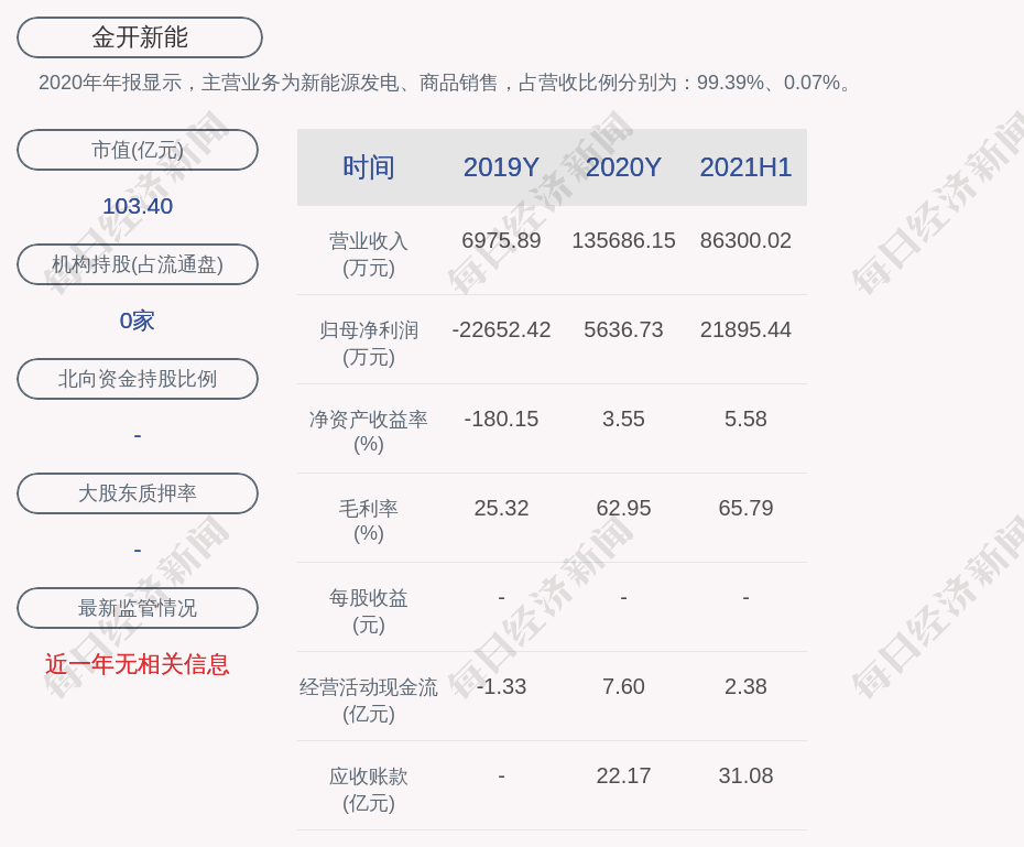2020年年报显示,金开新能的主营业务为新能源发电、商品销售。