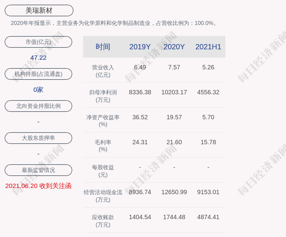 2020年年报显示,美瑞新材的主营业务为化学原料和化学制品制造业,占营收比例为:100.0%。
