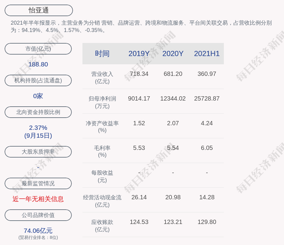 2021年半年报显示,怡亚通的主营业务为分销+营销、品牌运营、跨境和物流服务、平台间关联交易,占营收比例分别为:94.19%、4.5%、1.57%、-0.35%。