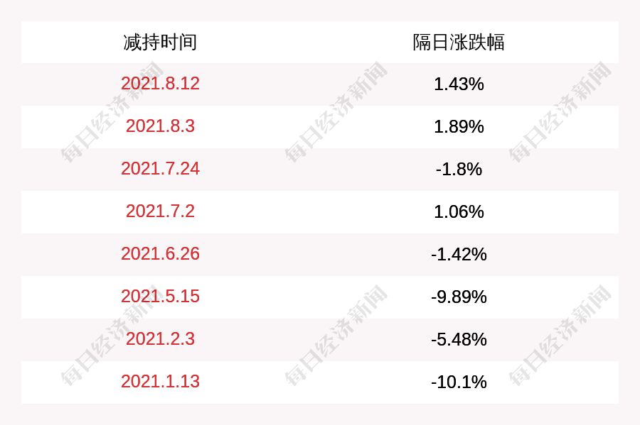 2. 润邦股份上次发布减持公告是2021年08月12日,第二个交易日上涨1.43%,润邦股份近一年共发布9次减持类公告。更多关键信息,请搜索“道达号”。