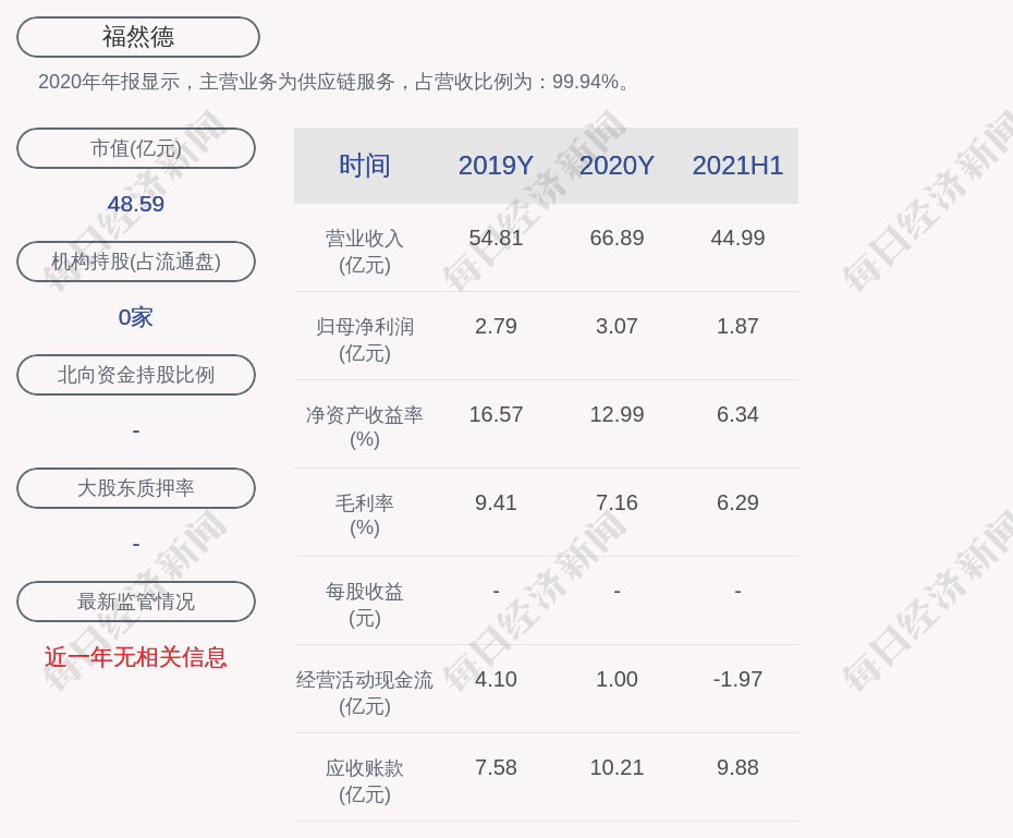 2020年年报显示,福然德的主营业务为供应链服务,占营收比例为:99.94%。