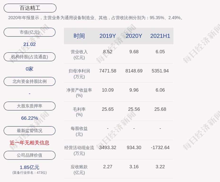 2020年年报显示,百达精工的主营业务为通用设备制造业、其他,占营收比例分别为:95.35%、2.49%。