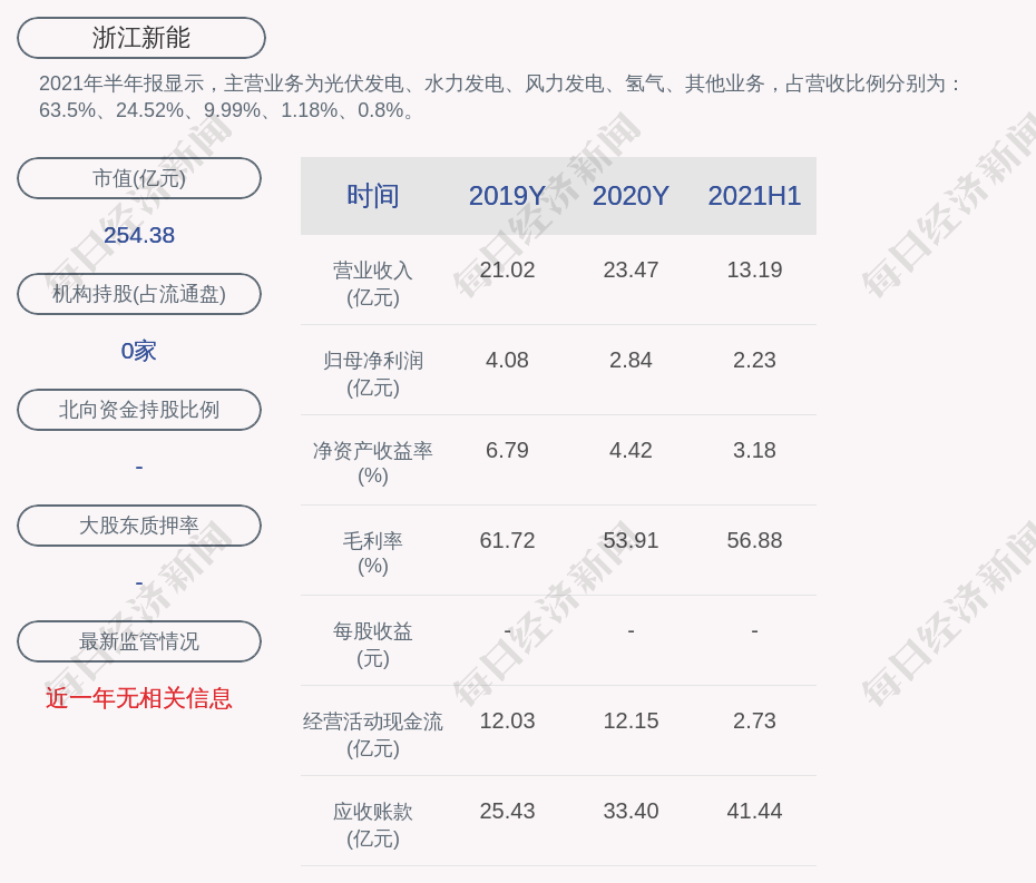 2021年半年报显示,浙江新能的主营业务为光伏发电、水力发电、风力发电、氢气、其他业务,占营收比例分别为:63.5%、24.52%、9.99%、1.18%、0.8%。
