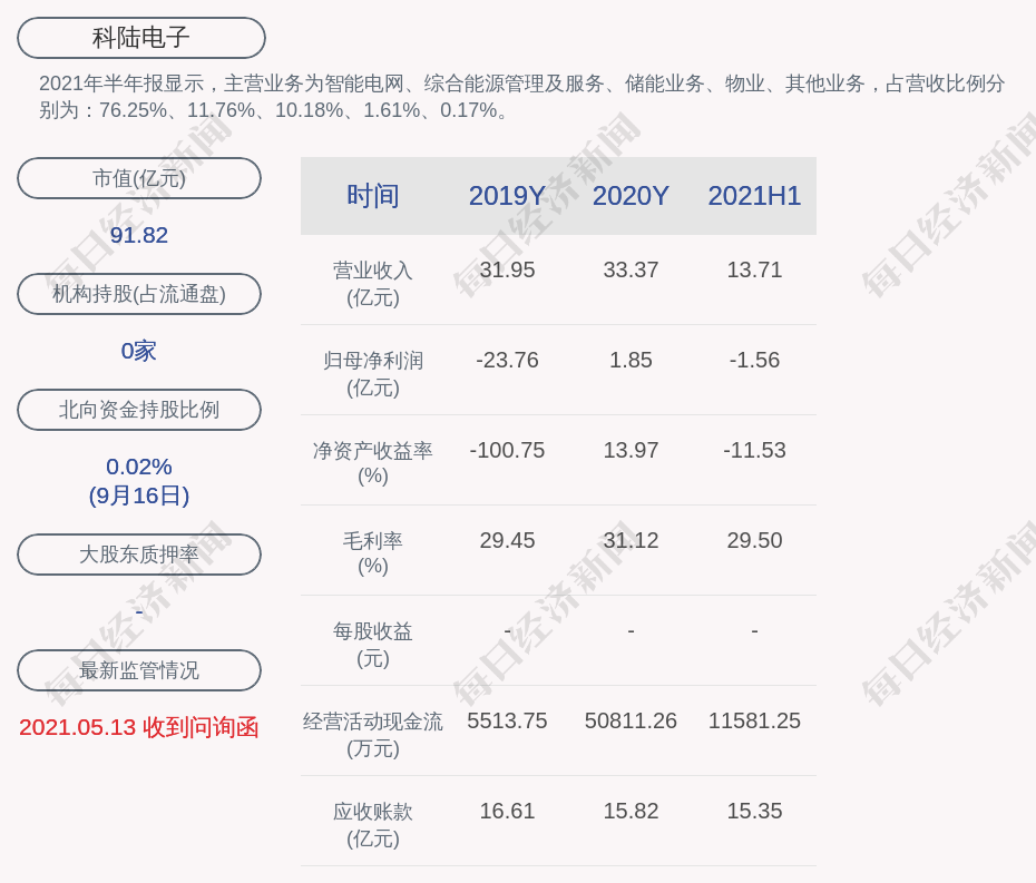 2021年半年报显示,科陆电子的主营业务为智能电网、综合能源管理及服务、储能业务、物业、其他业务,占营收比例分别为:76.25%、11.76%、10.18%、1.61%、0.17%。