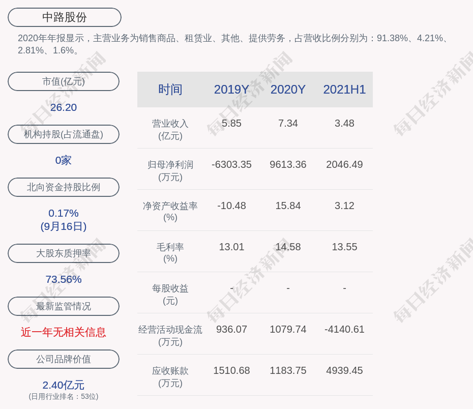 2020年年报显示,中路股份的主营业务为销售商品、租赁业、其他、提供劳务,占营收比例分别为:91.38%、4.21%、2.81%、1.6%。