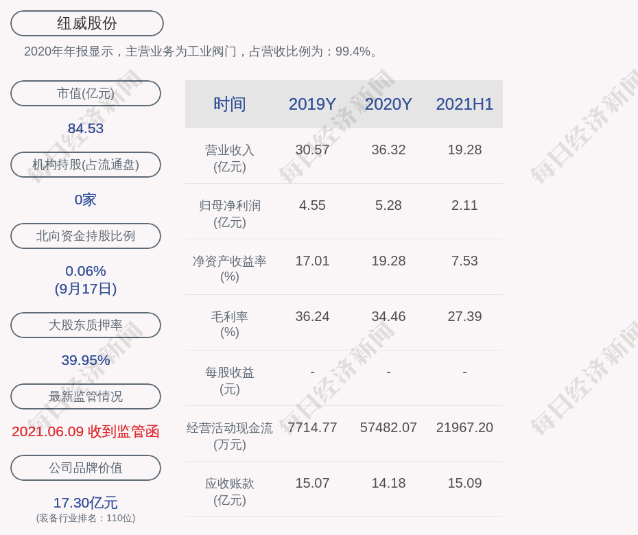 2020年年报显示,纽威股份的主营业务为工业阀门,占营收比例为:99.4%。