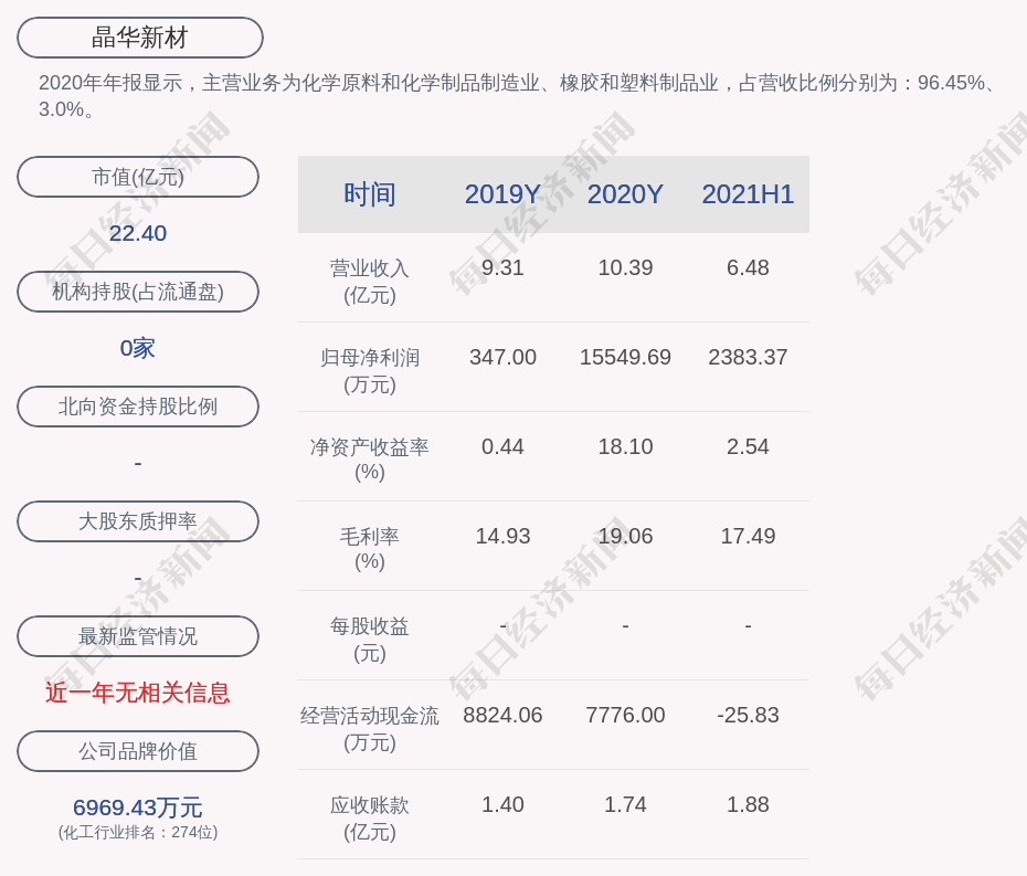 2020年年报显示,晶华新材的主营业务为化学原料和化学制品制造业、橡胶和塑料制品业,占营收比例分别为:96.45%、3.0%。