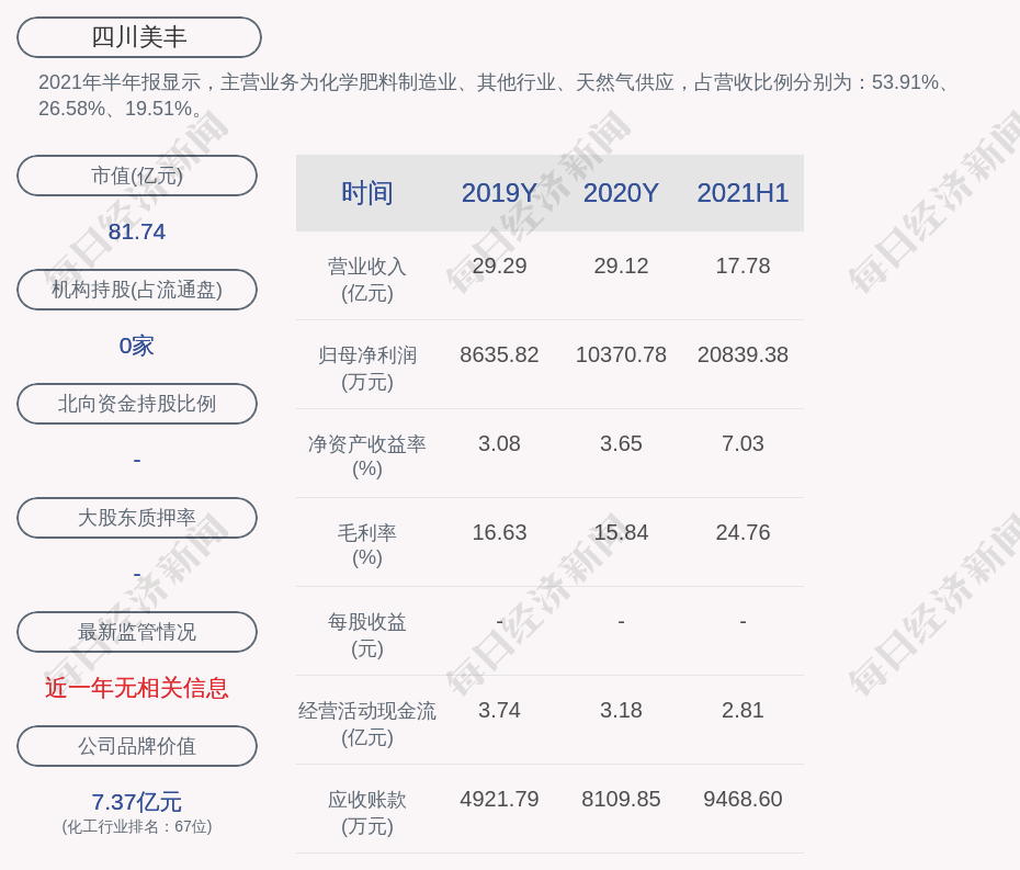2021年半年报显示,四川美丰的主营业务为化学肥料制造业、其他行业、天然气供应,占营收比例分别为:53.91%、26.58%、19.51%。