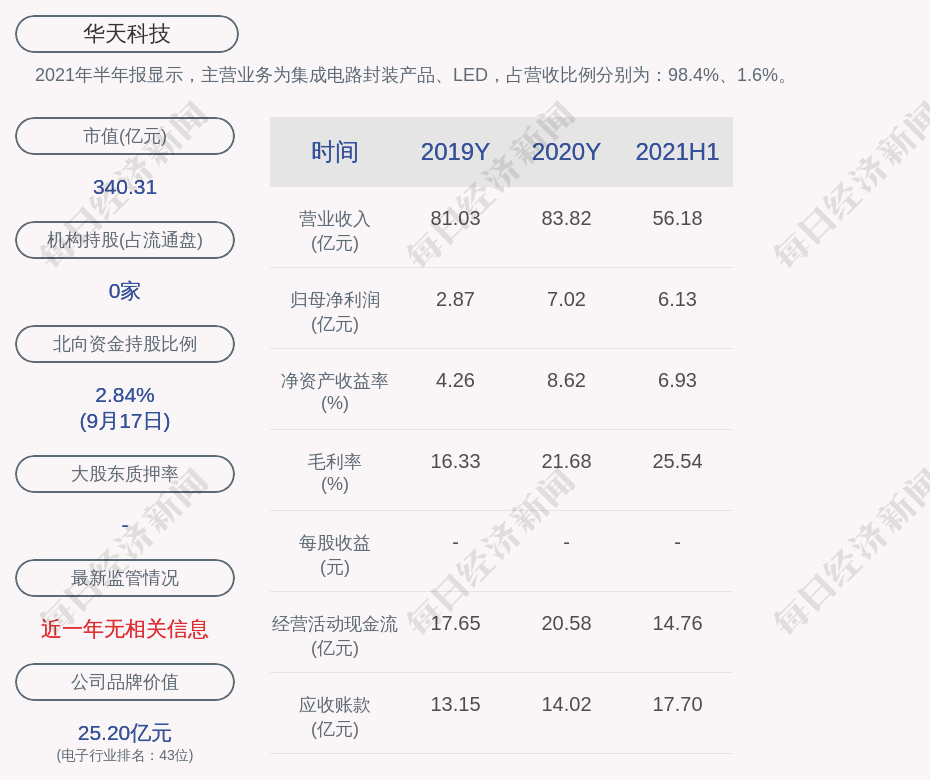 2021年半年报显示,华天科技的主营业务为集成电路封装产品、LED,占营收比例分别为:98.4%、1.6%。