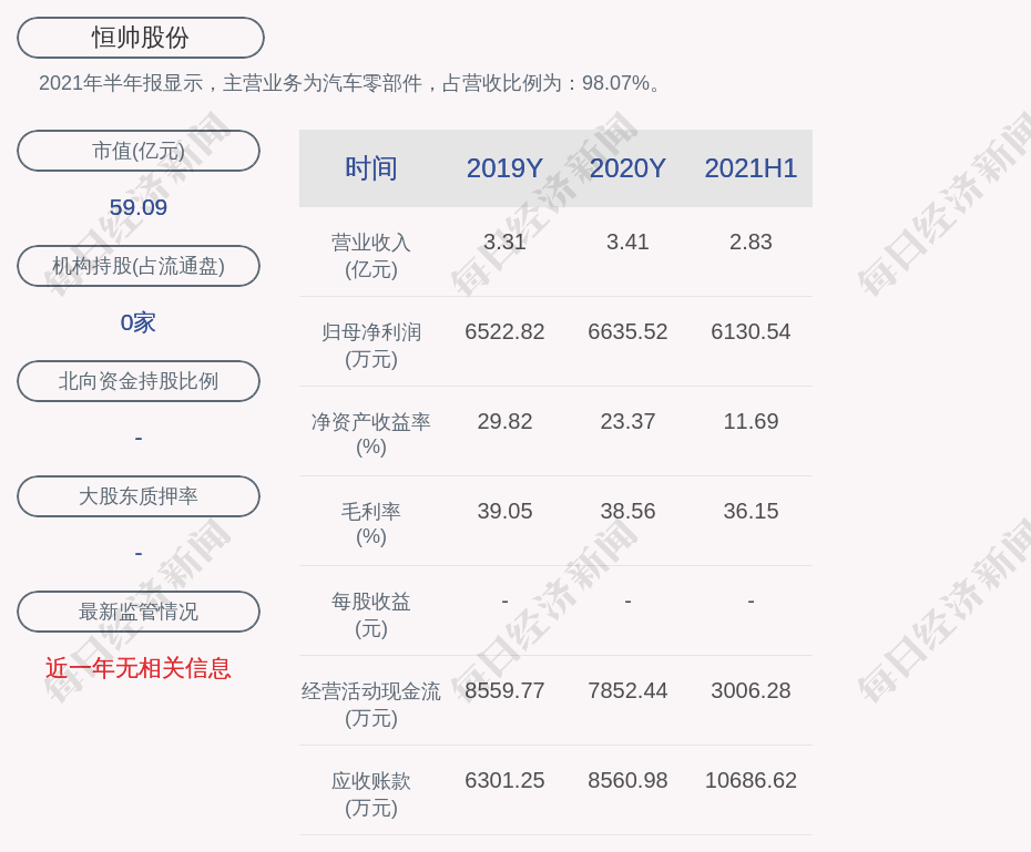 2021年半年报显示,恒帅股份的主营业务为汽车零部件,占营收比例为:98.07%。
