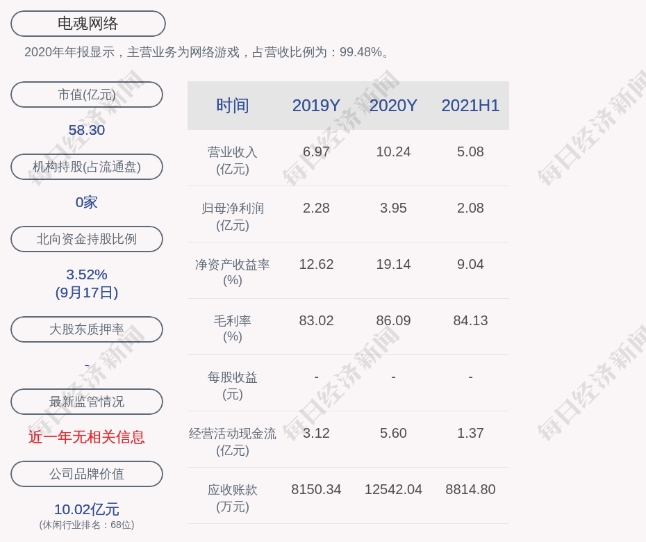 2020年年报显示,电魂网络的主营业务为网络游戏,占营收比例为:99.48%。
