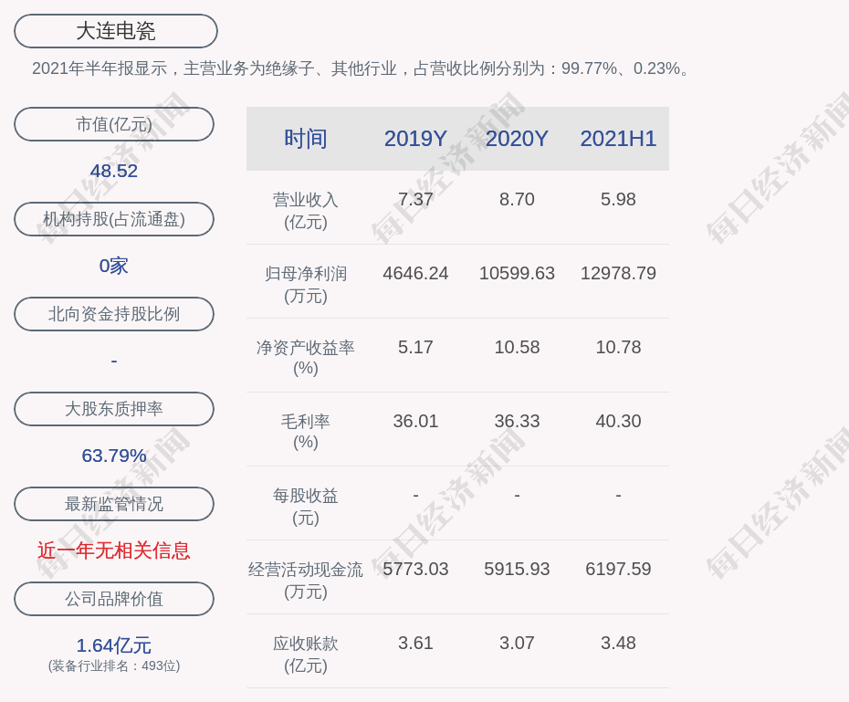 2021年半年报显示,大连电瓷的主营业务为绝缘子、其他行业,占营收比例分别为:99.77%、0.23%。